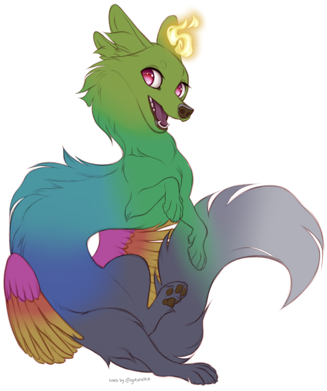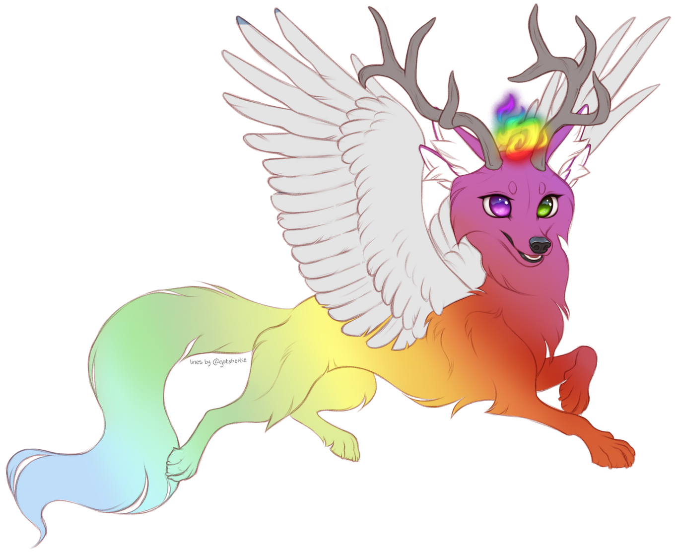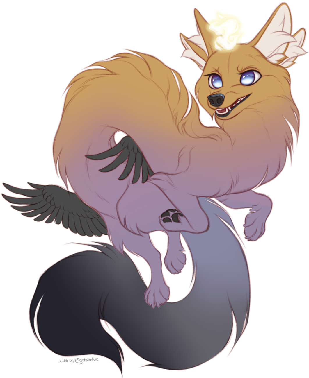 The guardian. Large beasts standing at over 180cm tall and sporting wings at the shoulder instead of hip, this rare version of the veliae can step out of the spirit plane and become visible to their charges and everyone around. These were the originals; the ones who were so enamored with the stories of the souls they tended that they agreed to lose their power. Most of this aspect still live among the forest of Life, serving no single soul, and are referred to as Caretakers by the deity. They have regained their original forms due to time and diligence, proving to Life that their love of one particular mortal wasn't a fleeting fancy.They vary in body types, sometimes having longer necks similar to the positives and some sport manes. All have either horns or antlers encircling their soulflames as a diadem would. While they could encourage and guide their charges in either positive or negative directions, the guardians prefer to protect physically and act as a friend rather than spirit guide. On occasion they will even grant their charge the permission to sit upon their backs in flight. Guardians do not have a general personality but vary far more greatly than their smaller variants do.They may wield minor magic or grant their mortals with magic specializations such as controlling a single element or shaping intangible illusions.
